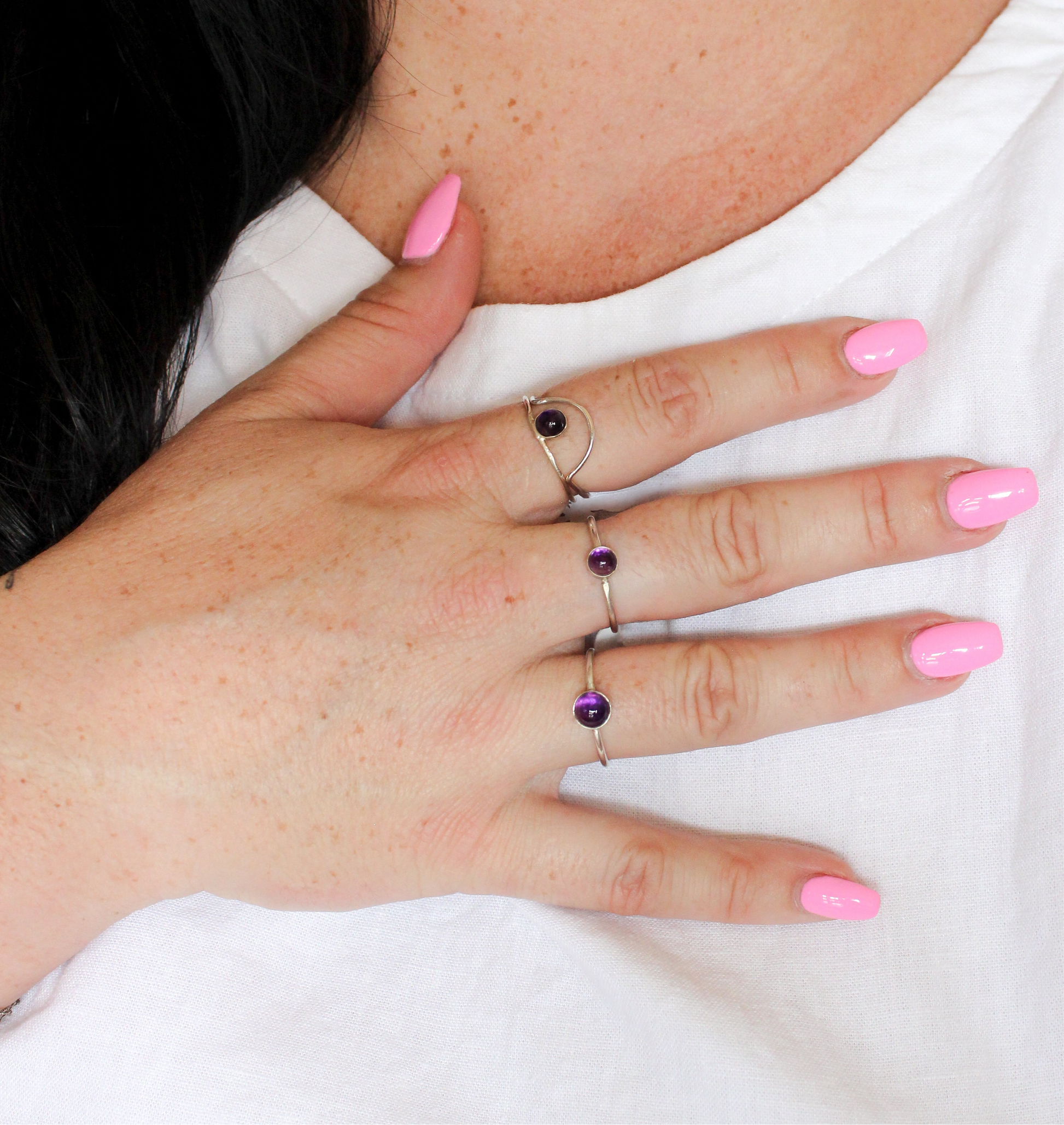 The Delilah Ring is a uniquely set Amethyst stone on a sterling silver band. Wear on its own or pair it with one of our other rings.